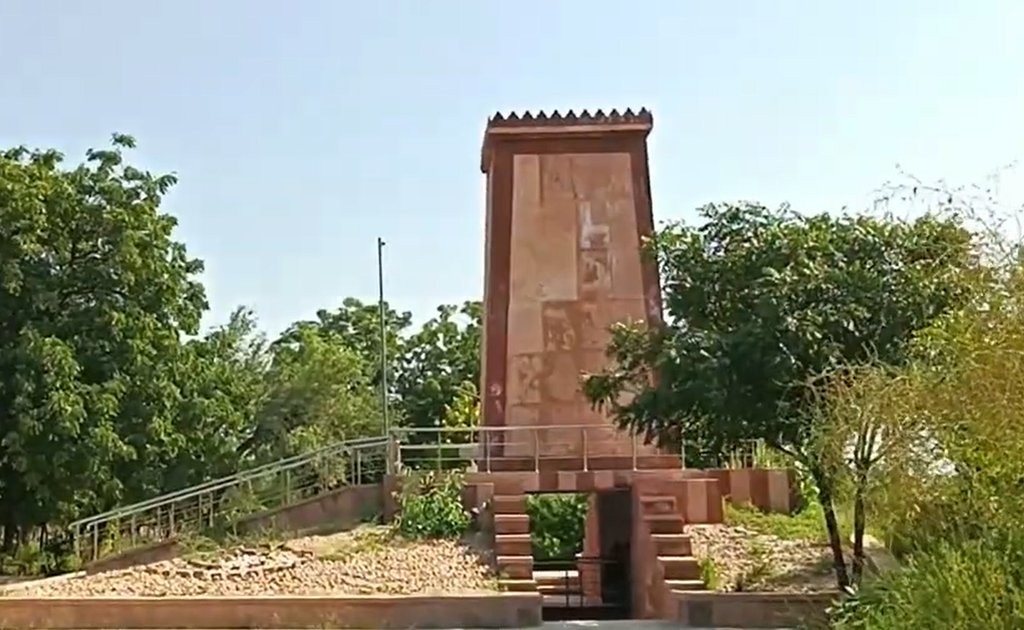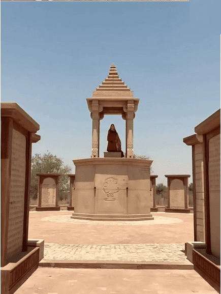 The towering monument stands with a statue of Amrita Devi. A plaque below it bears the names of all 363 martyrs.